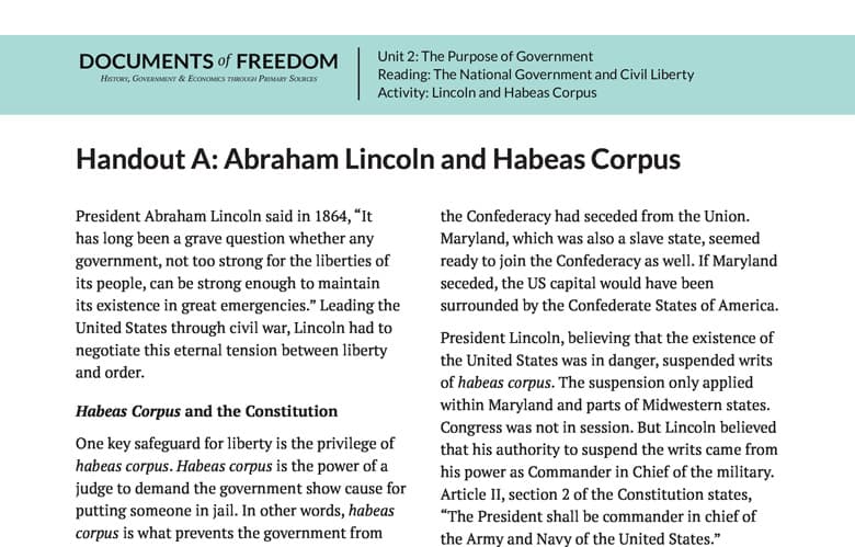 One key safeguard for liberty is the privilege of habeas corpus. Habeas corpus is the power of a judge to demand the government show cause for putting someone in jail. In other words, habeas corpus is what prevents the government from arresting people who have not committed crimes and locking them up without having to answer to anyone. A writ of habeas corpus requires that the Executive Branch bring the arrested person to court—literally, the phrase is Latin for “you shall have the body to be subjected to examination” (habeas corpus ad subjiciendum). Habeas corpus has also been called “the Great Writ,” and has its roots in the Magna Carta of 1215. The Founders knew habeas corpus was not only a traditional privilege, but also an essential safeguard of freedom. The Constitution guarantees that “The privilege of the writ of habeas corpus shall not be suspended, unless when in cases of rebellion or invasion the public safety may require it.” This provision appears in Article I, Section 9, which lists limits on the powers of Congress.