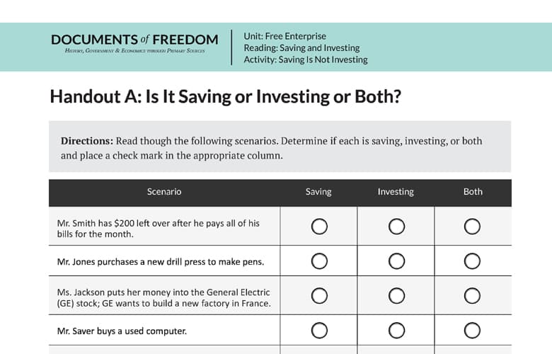 Directions: Read though the following scenarios. Determine if each is saving, investing, or both and place a check mark in the appropriate column.