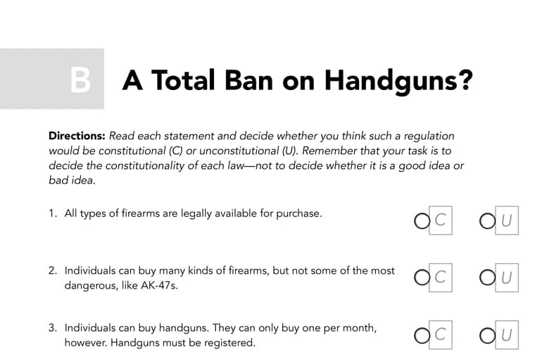Directions: Read each statement and decide whether you think such a regulation would be constitutional (C) or unconstitutional (U). Remember that your task is to decide the constitutionality of each law—not to decide whether it is a good idea or bad idea.