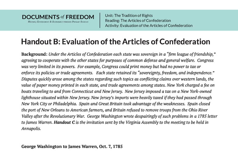 Background: Under the Articles of Confederation each state was sovereign in a “firm league of friendship,” agreeing to cooperate with the other states for purposes of common defense and general welfare. Congress was very limited in its powers. For example, Congress could print money but had no power to tax or enforce its policies or trade agreements. Each state retained its “sovereignty, freedom, and independence.” Disputes quickly arose among the states regarding such topics as conflicting claims over western lands, the value of paper money printed in each state, and trade agreements among states. New York charged a fee on boats traveling to and from Connecticut and New Jersey. New Jersey imposed a tax on a New York-owned lighthouse situated within New Jersey. New Jersey’s imports were heavily taxed if they had passed through New York City or Philadelphia. Spain and Great Britain took advantage of the weaknesses. Spain closed the port of New Orleans to American farmers, and Britain refused to remove troops from the Ohio River Valley after the Revolutionary War. George Washington wrote despairingly of such problems in a 1785 letter to James Warren. Handout C is the invitation sent by the Virginia Assembly to the meeting to be held in Annapolis.