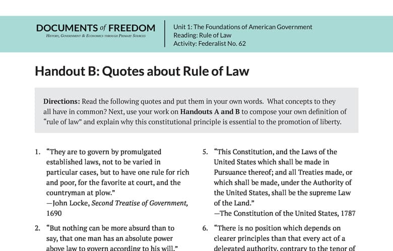 Directions: Read the following quotes and put them in your own words. What concepts to they all have in common? Next, use your work on Handouts A and B to compose your own definition of “rule of law” and explain why this constitutional principle is essential to the promotion of liberty.