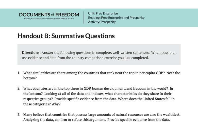 - What countries are in the top three in GDP, human development, and freedom in the world? In the bottom? Looking at all of the data and indexes, what characteristics do they share in their respective groups? Provide specific evidence from the data. Where does the United States fall in these categories? Why?
