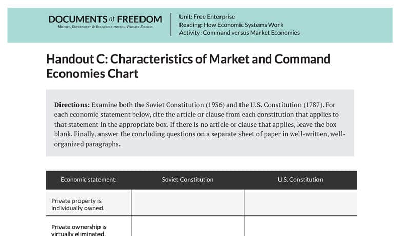 Directions: Examine both the Soviet Constitution (1936) and the U.S. Constitution (1787). For each economic statement below, cite the article or clause from each constitution that applies to that statement in the appropriate box. If there is no article or clause that applies, leave the box blank. Finally, answer the concluding questions on a separate sheet of paper in well-written, well-organized paragraphs.