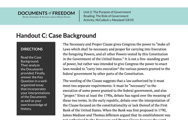The wording of the Clause suggests that a law authorized by it must meet two separate requirements: it must be “necessary” to the execution of some power granted to the federal government, and also “proper.” Since at least the 1790s, debate has raged over the meaning of these two terms. In the early republic, debate over the interpretation of the Clause focused on the constitutionality or lack thereof of the First Bank of the United States. When the Bank was first proposed in 1790, James Madison and Thomas Jefferson argued that its establishment was not authorized by the Necessary and Proper Clause because the word “necessary” should be interpreted to include only such measures as are truly essential to the implementation of other federal powers. By contrast, Secretary of the Treasury Alexander Hamilton defended the Bank, arguing that “necessary” should be interpreted to include any law that is “useful” or “convenient.” The issue of the constitutionality of the Bank did not reach the Supreme Court until 1819, when the justices decided the case of McCulloch v. Maryland.