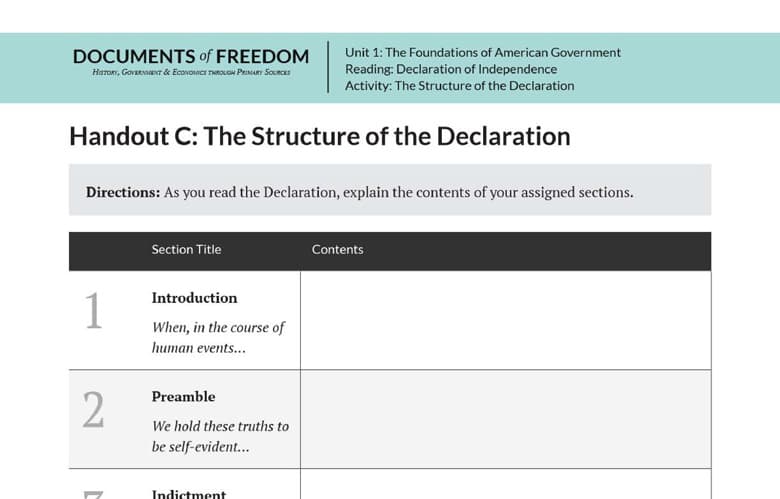 Directions: As you read the Declaration, explain the contents of your assigned sections.