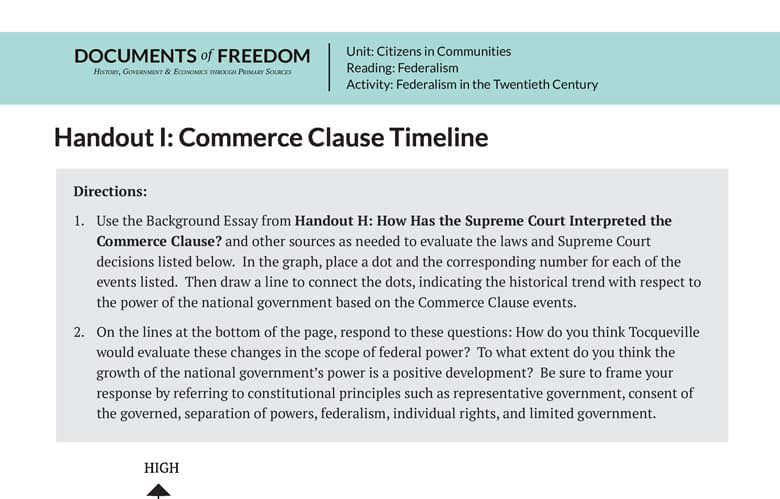 - Use the Background Essay from Handout H: How Has the Supreme Court Interpreted the Commerce Clause? and other sources as needed to evaluate the laws and Supreme Court decisions listed below. In the graph, place a dot and the corresponding number for each of the events listed. Then draw a line to connect the dots, indicating the historical trend with respect to the power of the national government based on the Commerce Clause events.
