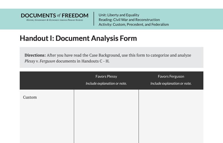 Directions: After you have read the Case Background, use this form to categorize and analyze Plessy v. Ferguson documents in Handouts C – H.