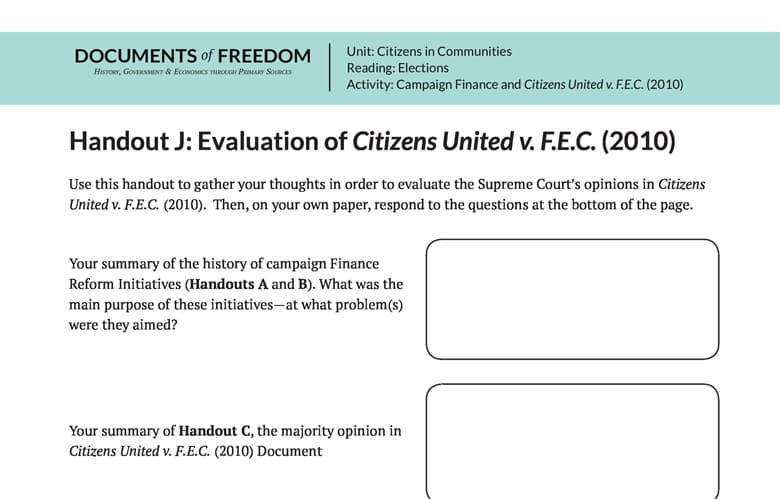 Use this handout to gather your thoughts in order to evaluate the Supreme Court’s opinions in Citizens United v. F.E.C. (2010). Then, on your own paper, respond to the questions at the bottom of the page.