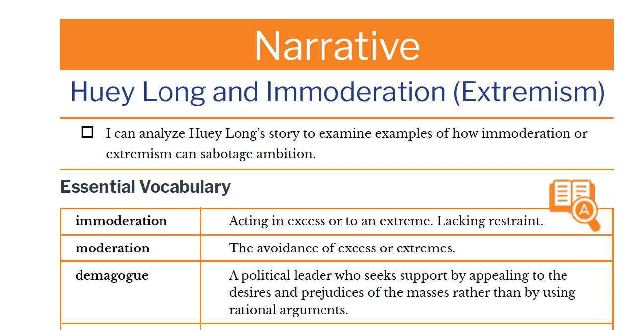 - I can analyze Huey Long’s story to examine examples of how immoderation or extremism can sabotage ambition