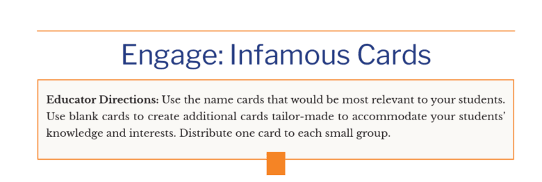 - Use the name cards that would be most relevant to your students. Use blank cards to create additional cards tailor-made to accommodate your students’ knowledge and interests. Distribute one card to each small group.