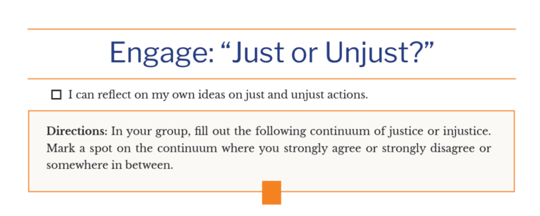 In your group, fill out the following continuum of justice or injustice. Mark a spot on the continuum where you strongly agree or strongly disagree or somewhere in between.