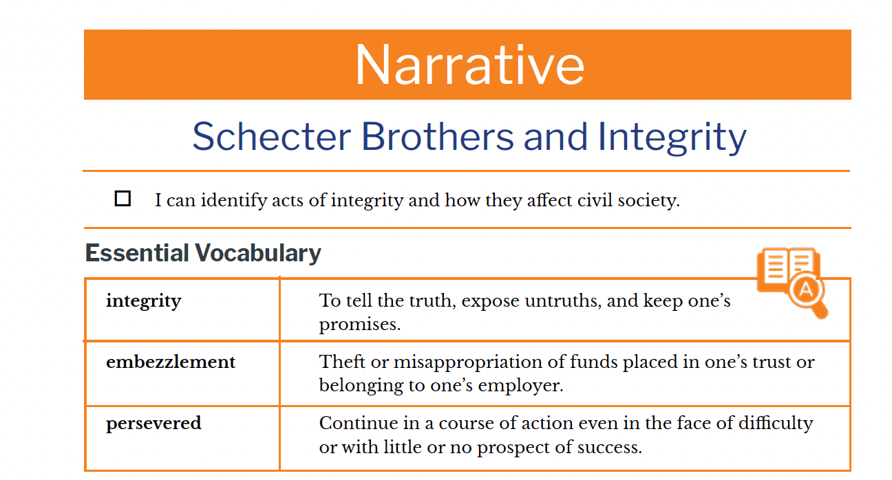 - Note the definition of “integrity” as a civic virtue that follows the Schechter Brothers and Integrity narrative. Describe the various ways the Schechter brothers acted with integrity in their communities.