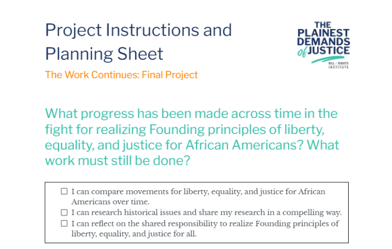 Across this resource, you have read the words of men and women who have been a part of a larger dialogue on the meaning of liberty, equality, and justice. For the final assessment, you may choose a group, individual, policy or legislation, or Supreme Court case not studied in the preceding lessons, OR a topic to explore further, and develop a project to educate your peers on the following driving question: What progress has been made across time in the fight for realizing Founding principles of liberty, equality, and justice for African Americans? What work must still be done?