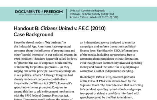 Case background and primary source documents concerning the Supreme Court case of Citizens United v. F.E.C. Dealing with free speech in the political arena, this lesson asks students to asses whether or not the Supreme Court ruled correctly in Citizens United in light of constitutional principles including republican government, freedom of speech, and property rights.