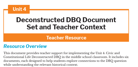 This document provides teacher support for implementing the Unit 4: Civic and Constitutional Life Deconstructed DBQ in the middle school classroom. It includes six documents, each designed to help students explore connections to the DBQ question while understanding the relevant historical context.