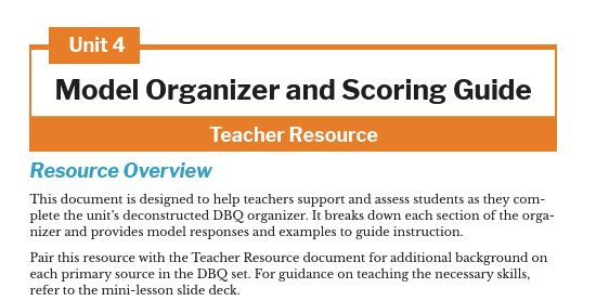 This document is designed to help teachers support and assess students as they complete the unit’s deconstructed DBQ organizer. It breaks down each section of the organizer and provides model responses and examples to guide instruction.